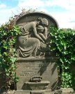 features a high-relief group of a seated, mourning woman with an angel standing behind her holding an